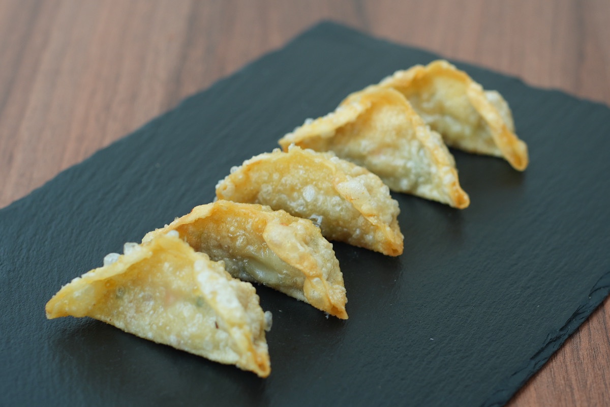 5 pics chicken or vegetable gyoza dumplings with ponzu sauce.