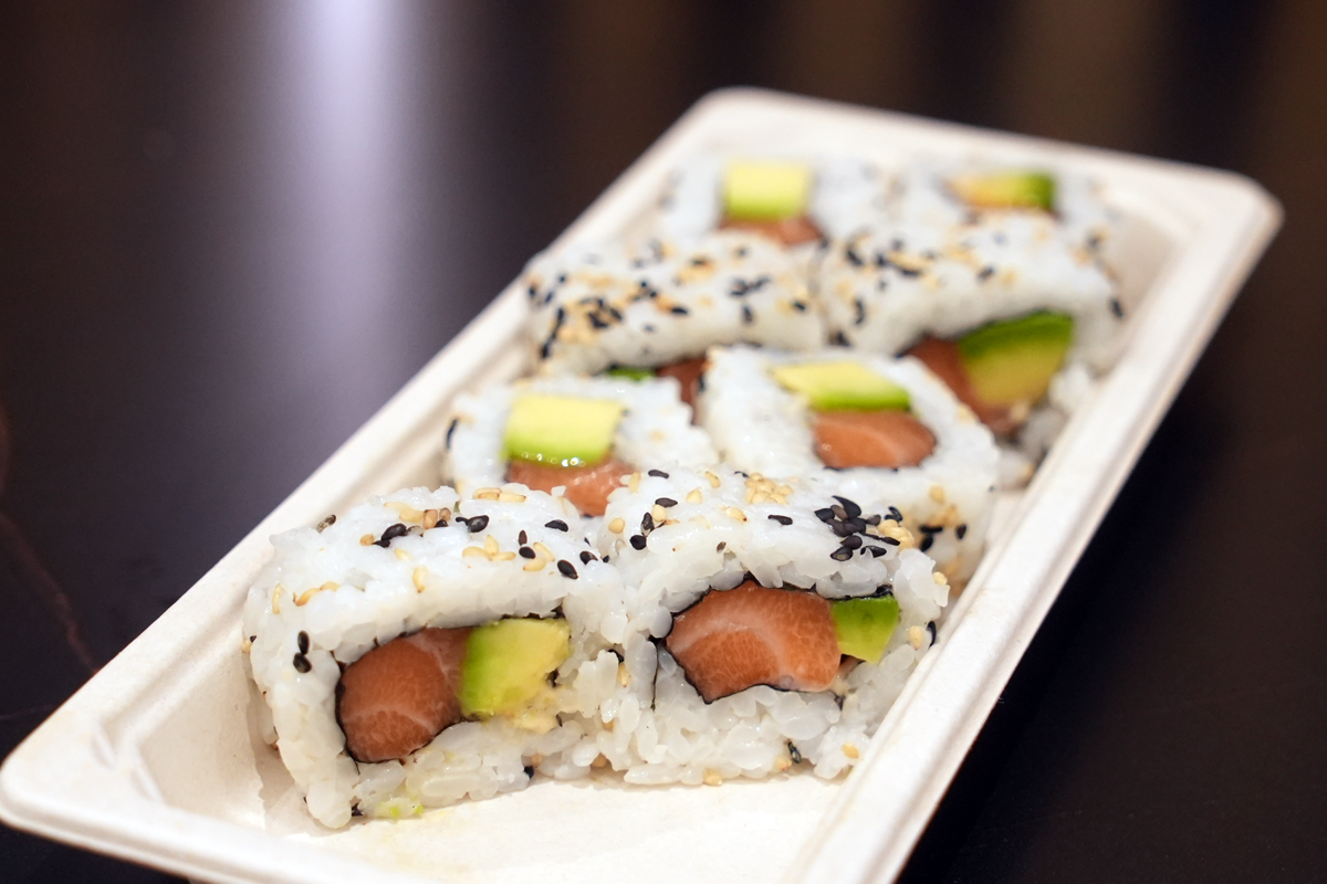 8 pics salmon avocado roll with Japanese teriyaki mayonnaise