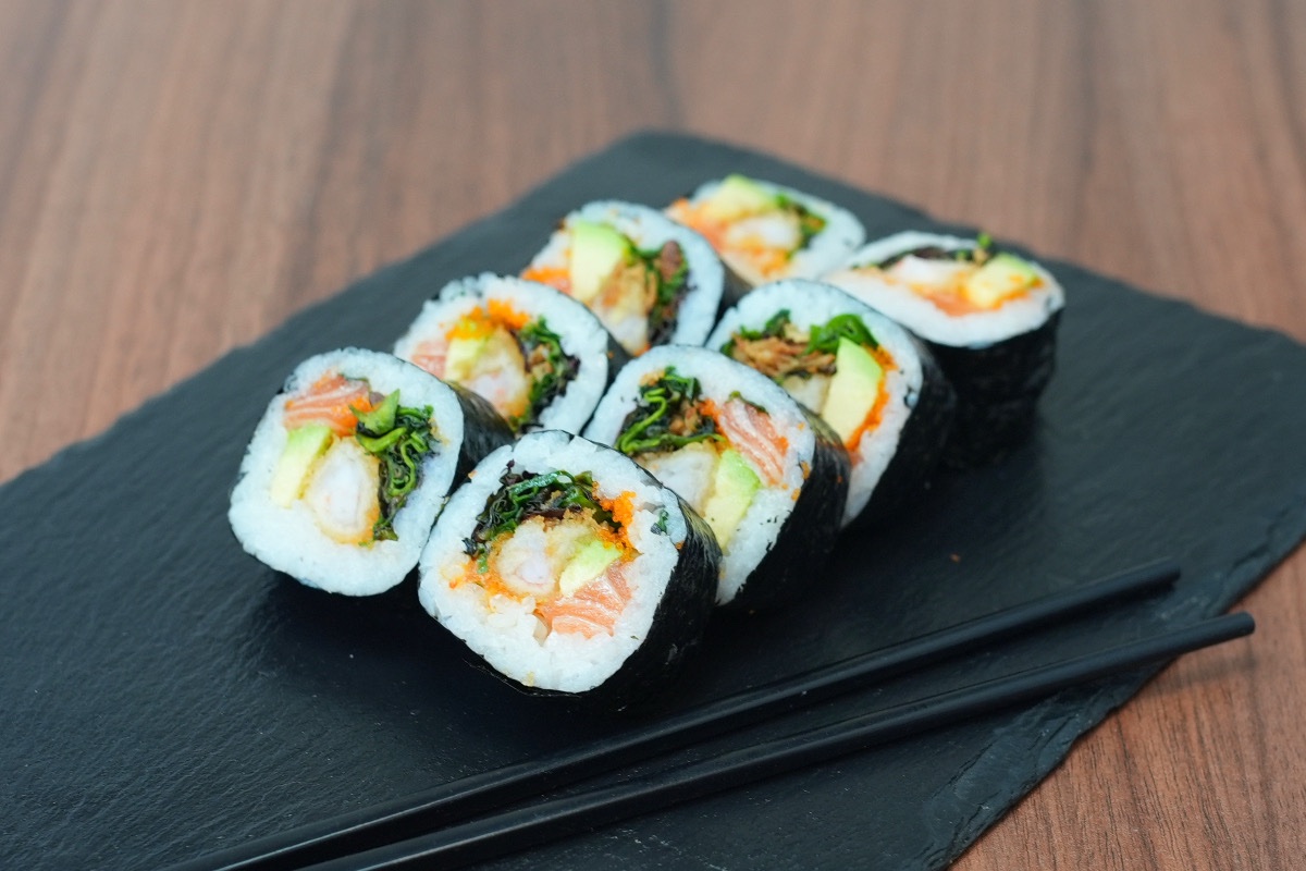 Nori, sushi rice, lettuce, cream cheese, caviar, fried shallots, salmon, epi prawn, avocado, Japanese teriyaki mayonnaise