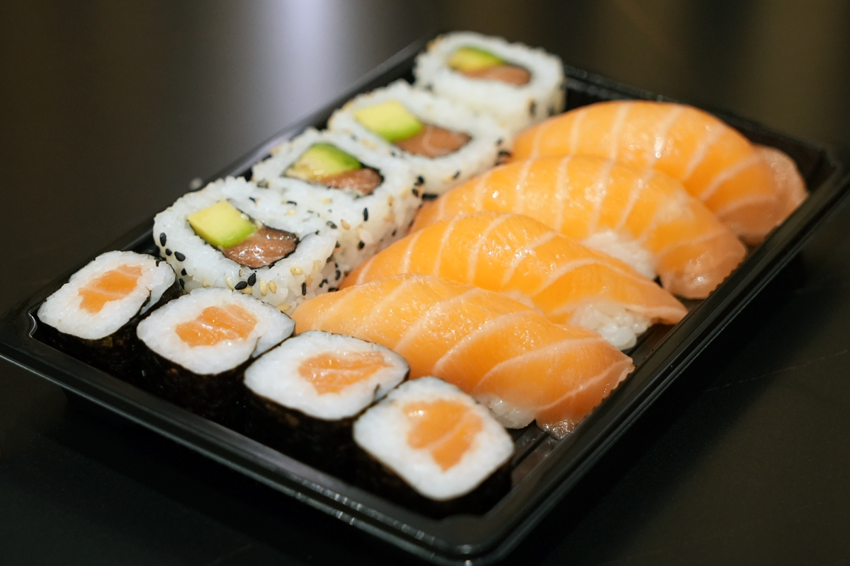 12 pics salmon avocado uramaki, salmon maki and salmon nigiri