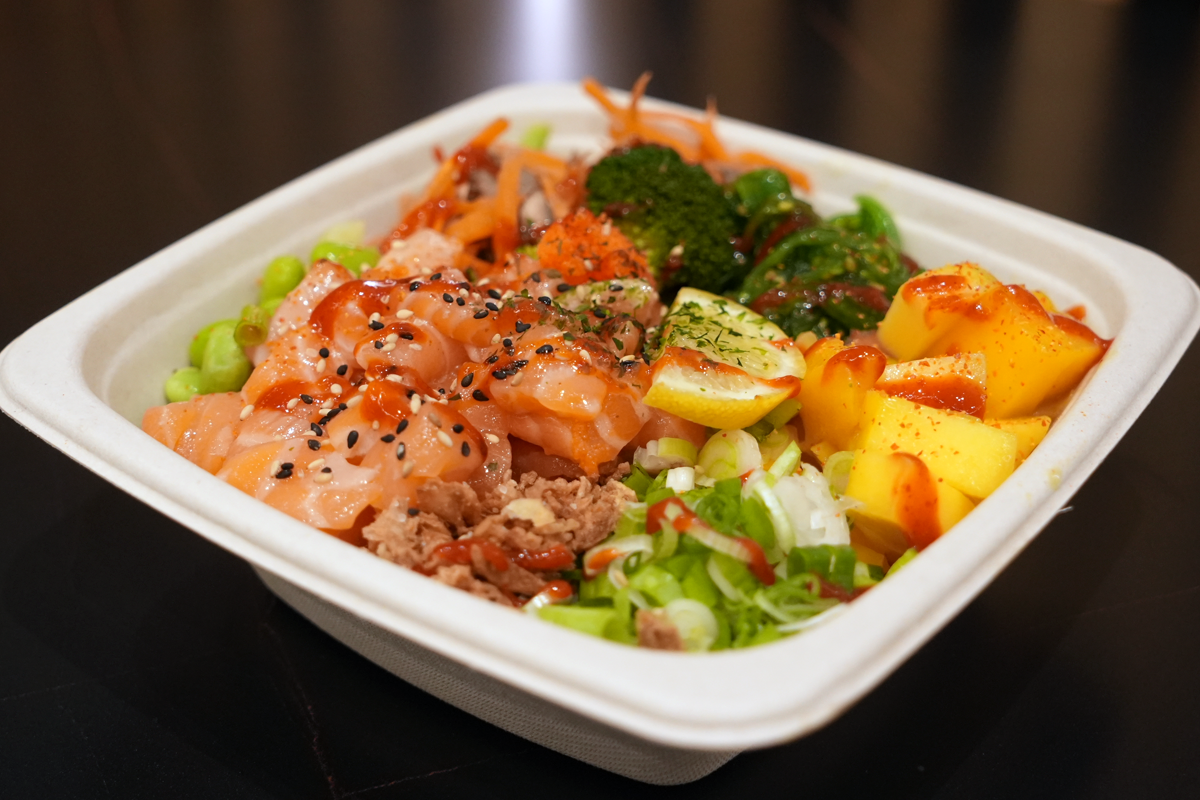 Fresh salmon, sushi rice, mix salad leaves, edamame beans, mango, seaweed salad, fried shallots, spring onion, caviar, red chillies, broccoli, carrot, mushrooms, sesame seed, slice lemon, punzo sauce, and sriracha sauce
