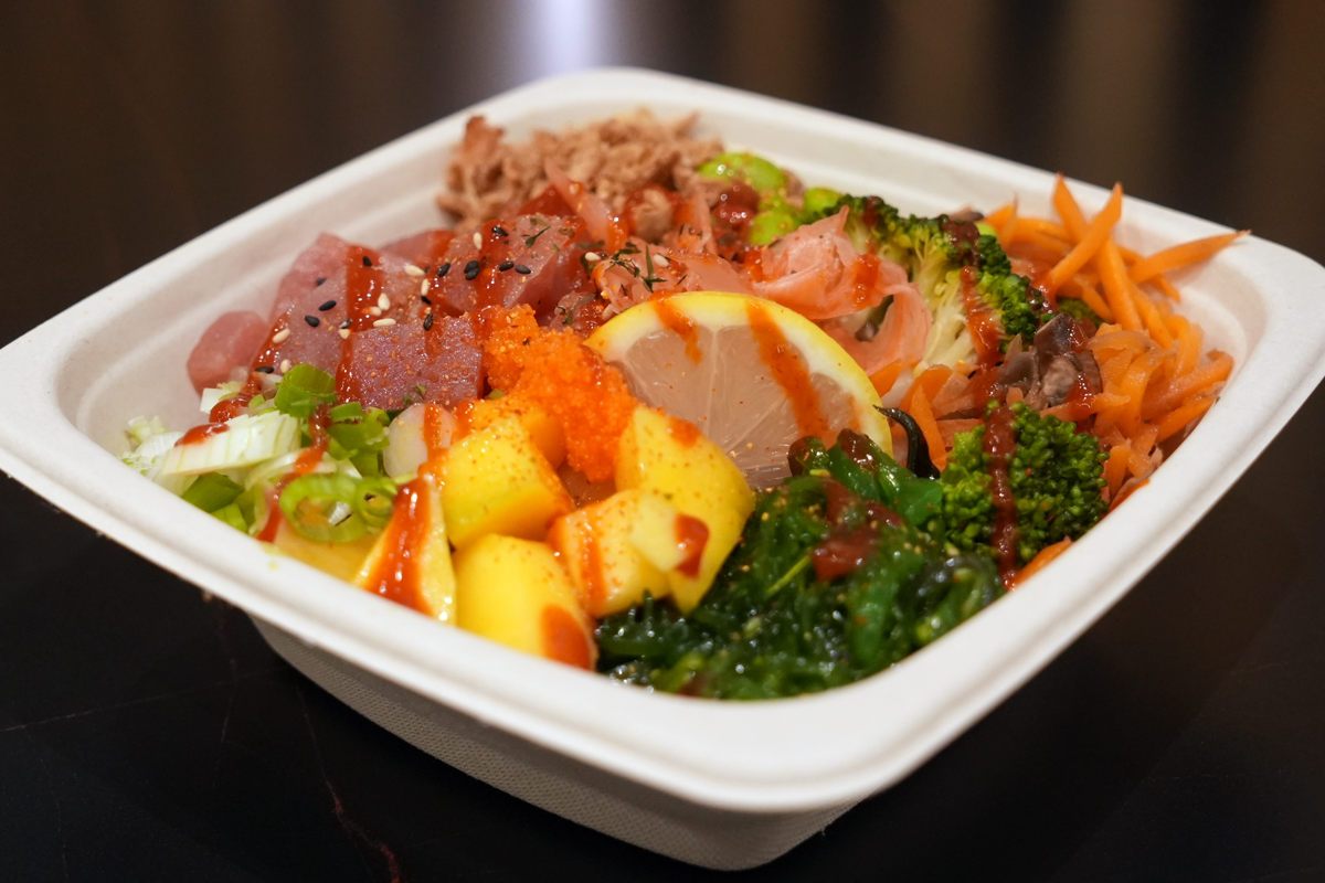 beans, mango, seaweed salad, fried shallots, spring onion, caviar, red chillies, broccoli, carrot, mushrooms, sesame seed, slice lemon, punzo sauce, and sriracha sauce